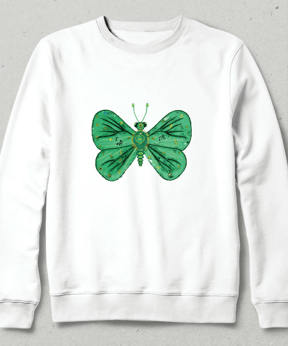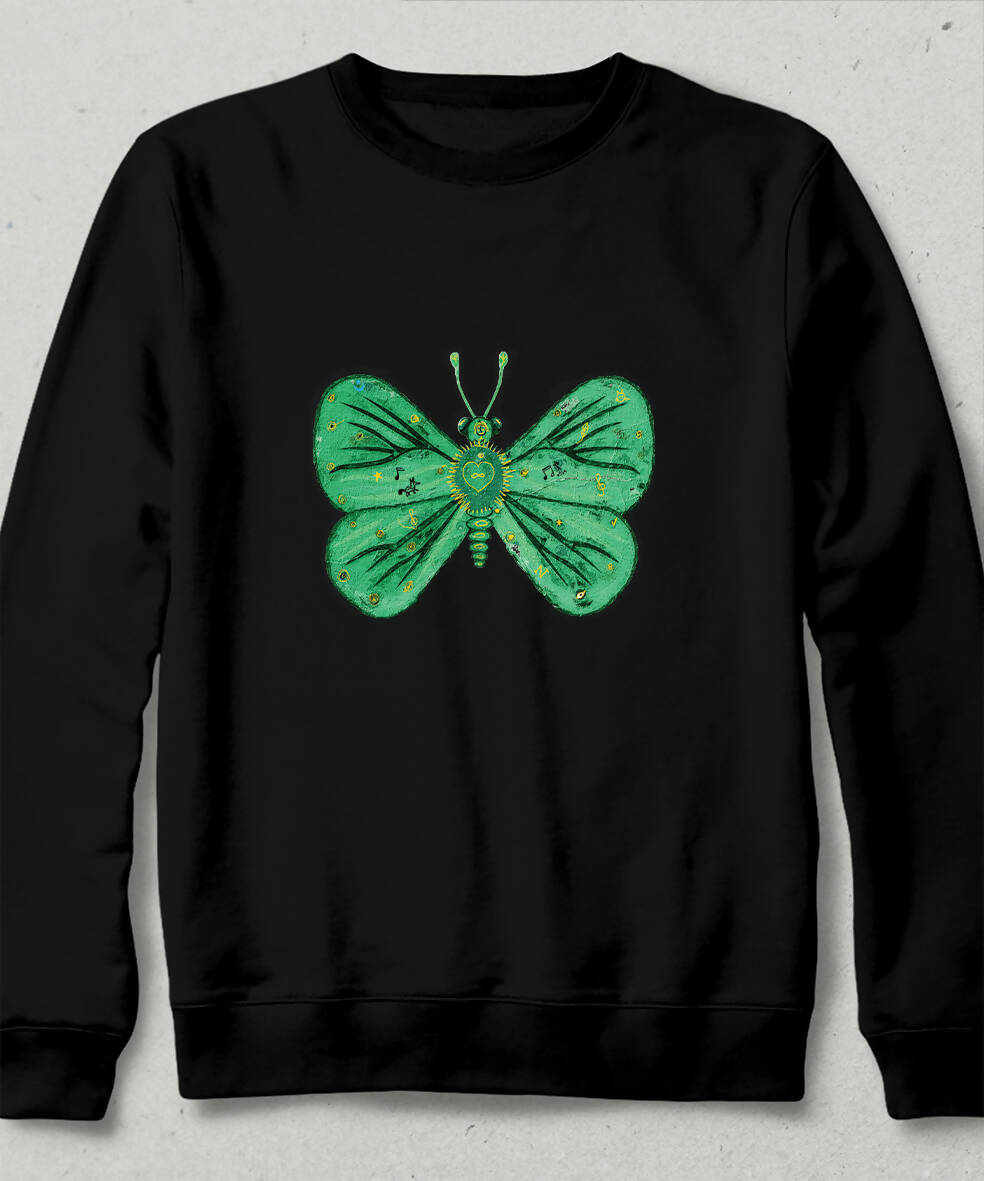 Motifli Turkuaz Yeşili Kelebek Yağlı Boya Tasarım Unisex Sweatshirt