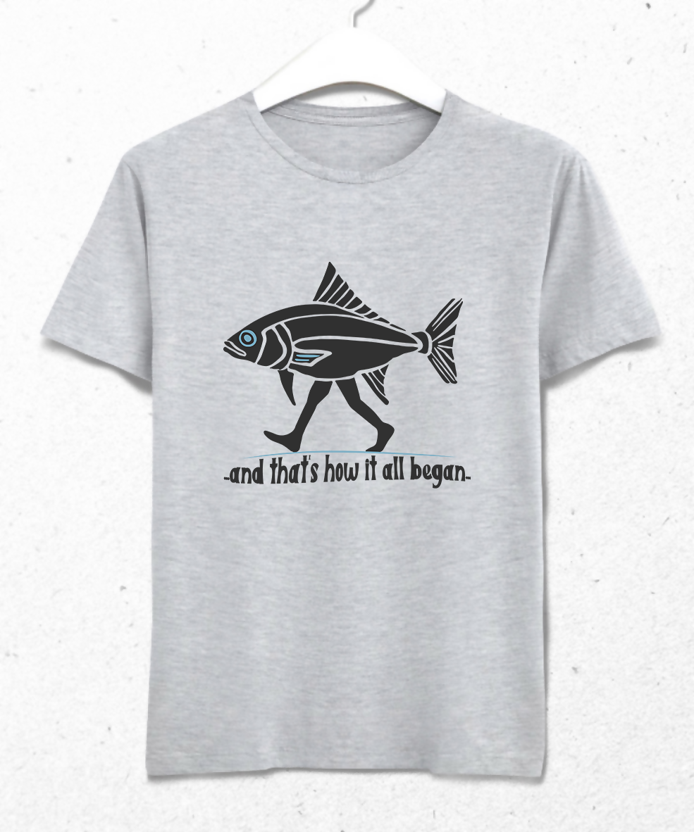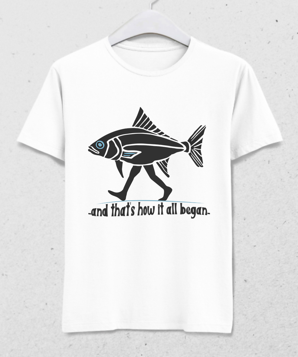 Dalış kültürüne absürt ve eğlenceli bir bakış açısı sunan bu tasarım, su altından karaya atılan o ilk adımı mizahi bir şekilde tasvir ediyor. İnsan bacakları üzerinde yürüyen balık, dalgıçların “her şey böyle başladı” hissini yansıtan esprili bir metafor oluşturuyor.