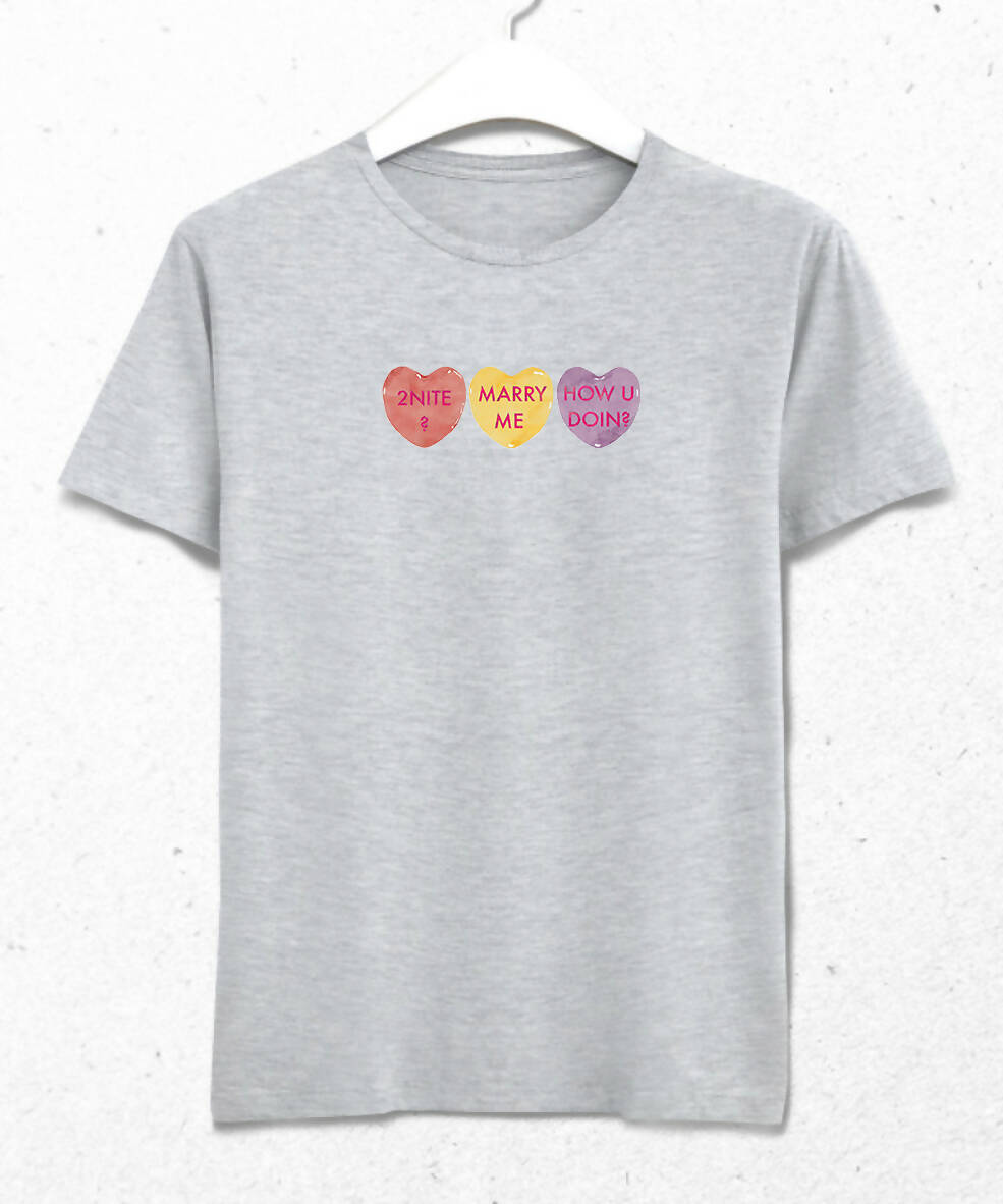 Sevgililer günü şekeri desenli beyaz erkek tişört. %100 pamuklu penye kumaştan üretilir. Tüm t-shirtler Direct-to-Garment (DTG) teknolojisi ile basılır. Doğrudan...